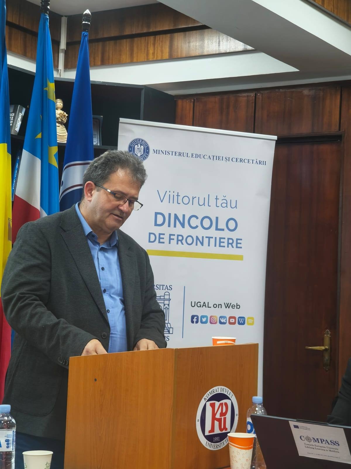 С 27 по 29 ноября 2025 года в стенах Комратского государственного университета прошла конференция «Языки, литература и лингвистика», организованная Трансграничным факультетом Университета «Дунай де Жос» в мун. Галац (Румыния) в партнёрстве с Комратским государственным университетом, Брэиловским музеем «Кароль I» (Румыния) и Кишинёвским государственным педагогическим университетом им. «Ion Creangă». Официальное открытие конференции состоялось 27 ноября 2025 года и было ознаменовано приветственным словом администрации Комратского государственного университета, а также руководством факультета университета-партнёра из мун. Галац (Румыния). От имени Трансграничного факультета с обращением выступила Декан факультета, конф. унив., доктор инж., Кармелия-Мариана Бэлэныкэ-Драгомир, которая подчеркнула существующие возможности для дальнейшего укрепления партнёрства между двумя учреждениями в продвижении румынского языка (Румыния), а также европейских ценностей посредством академических мероприятий, проводимых в мун. Комрат (Республика Молдова). На мероприятии также присутствовал примар муниципия Комрат Господин Сергей Анастасов, поддерживающий образовательные проекты, осуществляемые в регионе АТО Гагаузия. В ходе открытия конференции была подчёркнута важность укрепления академического сотрудничества, продвижения румынского языка и развития совместных образовательных инициатив между партнерами. Преподаватели и студенты Комратского государственного университета, а также слушатели курсов румынского языка, организованные Трансграничным факультетом, активно приняли участие в работе конференции. Участники представили свои доклады в рамках рабочих секций конференции, продемонстрировав высокий уровень подготовки и заинтересованность в развитии лингвистических и культурных исследований. В первый день мероприятия в рамках пленарного заседания были представлены два содержательных доклада приглашённых гостей: – директора Брэиловского музея «Кароль I» (Румыния),