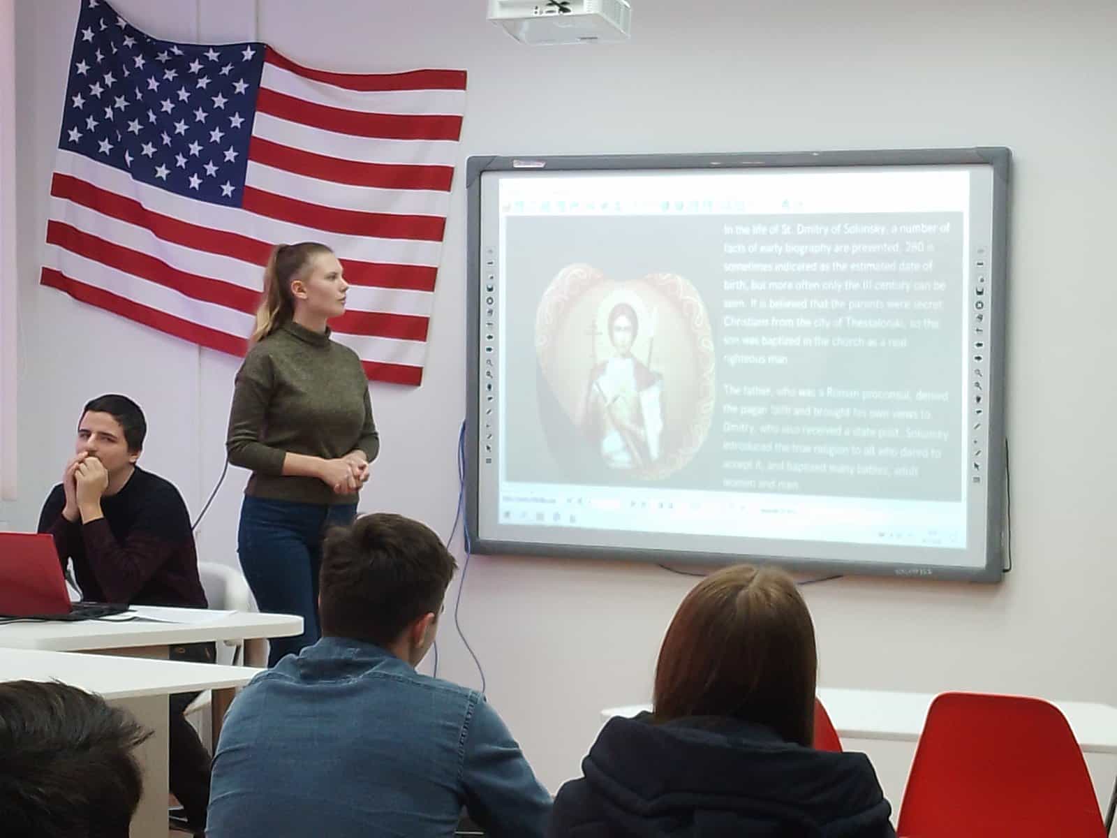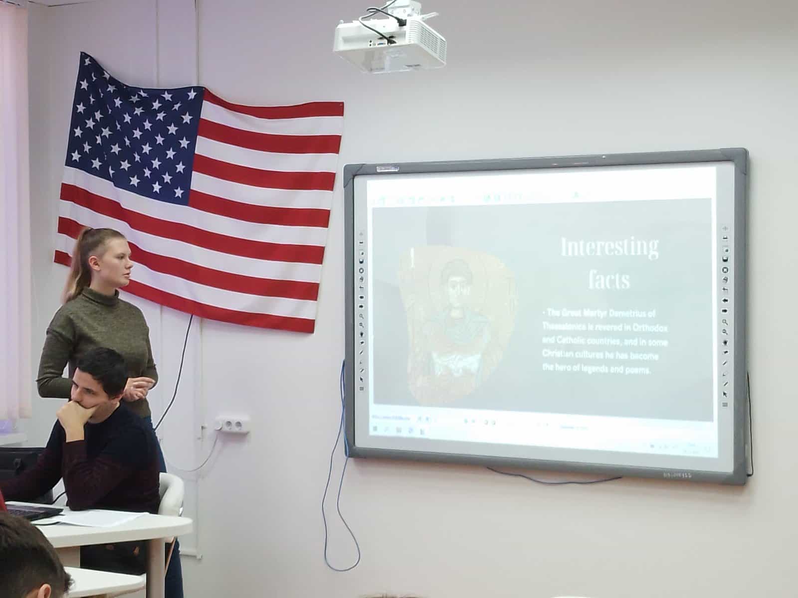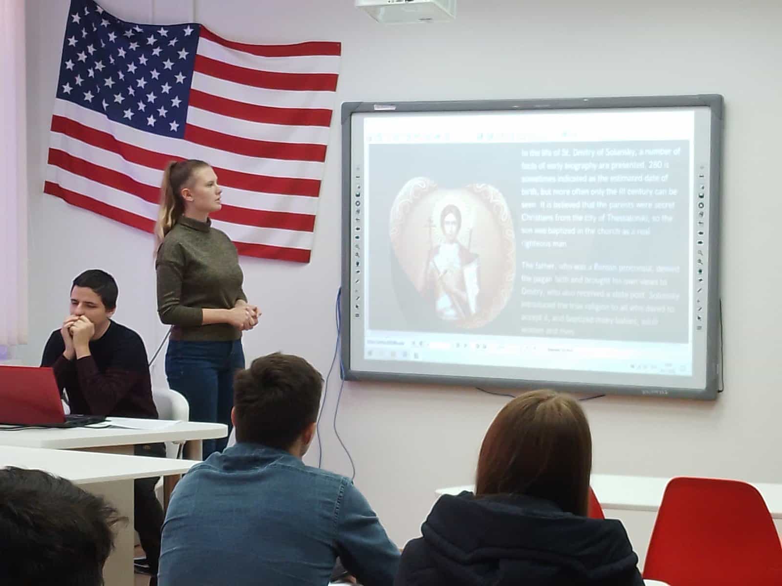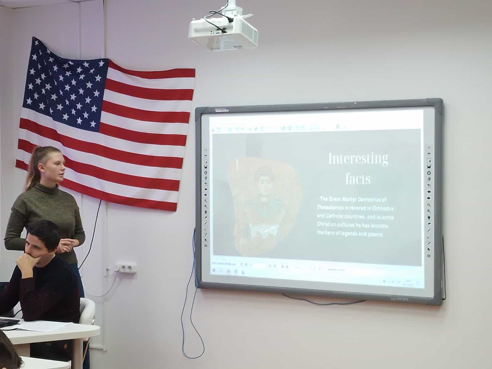 Студенты усердно работали над проектом. Они искали информацию об истории праздника, обычаях и традициях. Ольга Кусурсуз из группы АН-20 сделала очень интересную презентацию о святом Дмитрии Солунском. Так студенты узнали, что Димитрий Солунский, или Димитрий Фессалоникийский был христианским святым, почитаемым в лике великомучеников, пострадал он во время правления императора Максимиана и что память его совершается в Православной церкви 8 ноября.