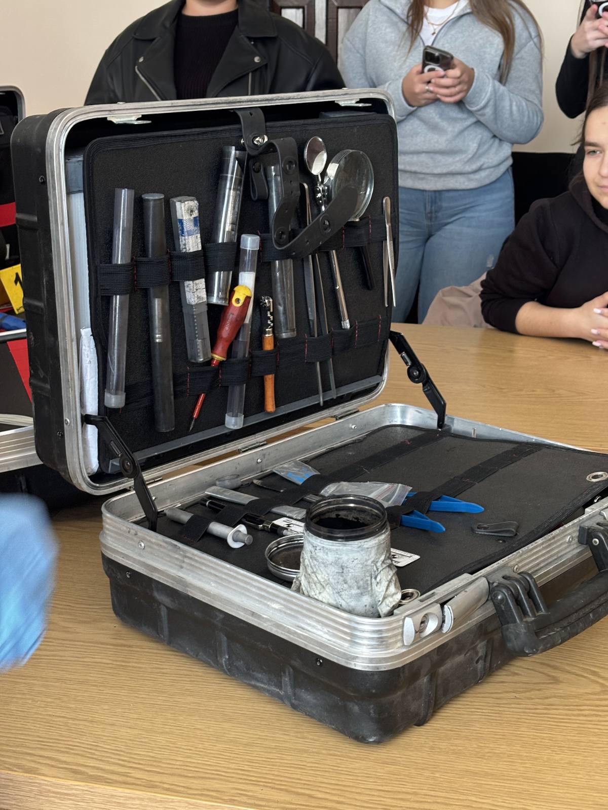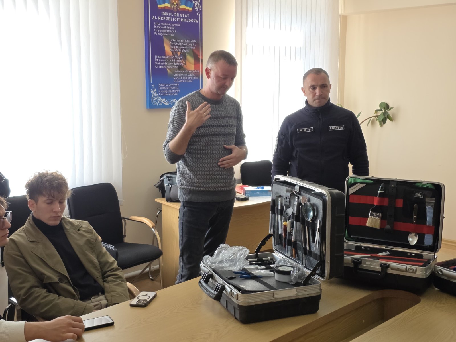 Мероприятие провели сотрудники Управления Полиции АТО Гагаузии, профессионалы в области криминалистики, с многолетним опытом работы в правоохранительных органах. Во время встречи криминалисты показали несколько типов чемоданчиков, каждый из которых предназначен для решения различных задач в рамках процесса. Среди продемонстрированного оборудования были: чемоданчик для сбора следов: наборы для работы с биологическими и физическими следами (например, для забора отпечатков пальцев, сбора волокон, следов обуви; чемоданчики для анализа улик. Специальные инструменты для упаковки и хранения вещественных доказательств, а также устройства для первичной диагностики. Криминалисты продемонстрировали, как правильно собирать и фиксировать улики, рассказали о важности соблюдения цепочки хранения доказательств, а также о том, как использование специального оборудования помогает избежать ошибок в процессе расследования. В ходе мероприятия студенты проявили живой интерес к представленным материалам. Многие задавали вопросы о практике применения инструментов и о том, как криминалисты обучаются использованию такого оборудования. Особенно студентов заинтересовали детали работы с чемоданчиками для сбора следов пальцев.